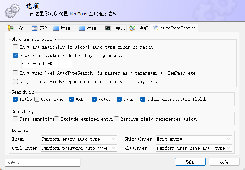 在全局自动输入找不到对应条目时,会弹出一个搜索框,可以进行快速搜索,这个插件会在工具->选项页面新增一个此插件设置的标签页,点击即可参考我的标签页设置。
